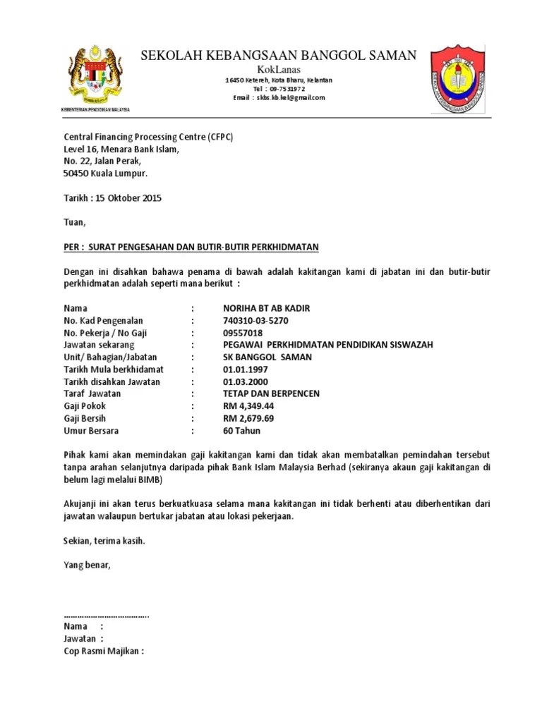 Isikan maklumat gaji secara terperinci. Surat penukaran jabatan atau surat penempatan, jika berkenaan. Didalam surat ini perlu dipaparkan maklumat pekerja, jawatan, tempoh perkhidmatan, gaji dan sebagainya yang berkenaan. Mar 03, 2020 · contoh surat pengesahan majikan dan jawatan. Satu (1) salinan surat perakuan majikan ; Disahkan lulus pengesahan immigration security clearance (isc) yang dilakukan di negara sumber. Sekiranya anda kerja sendiri maka anda perlu.